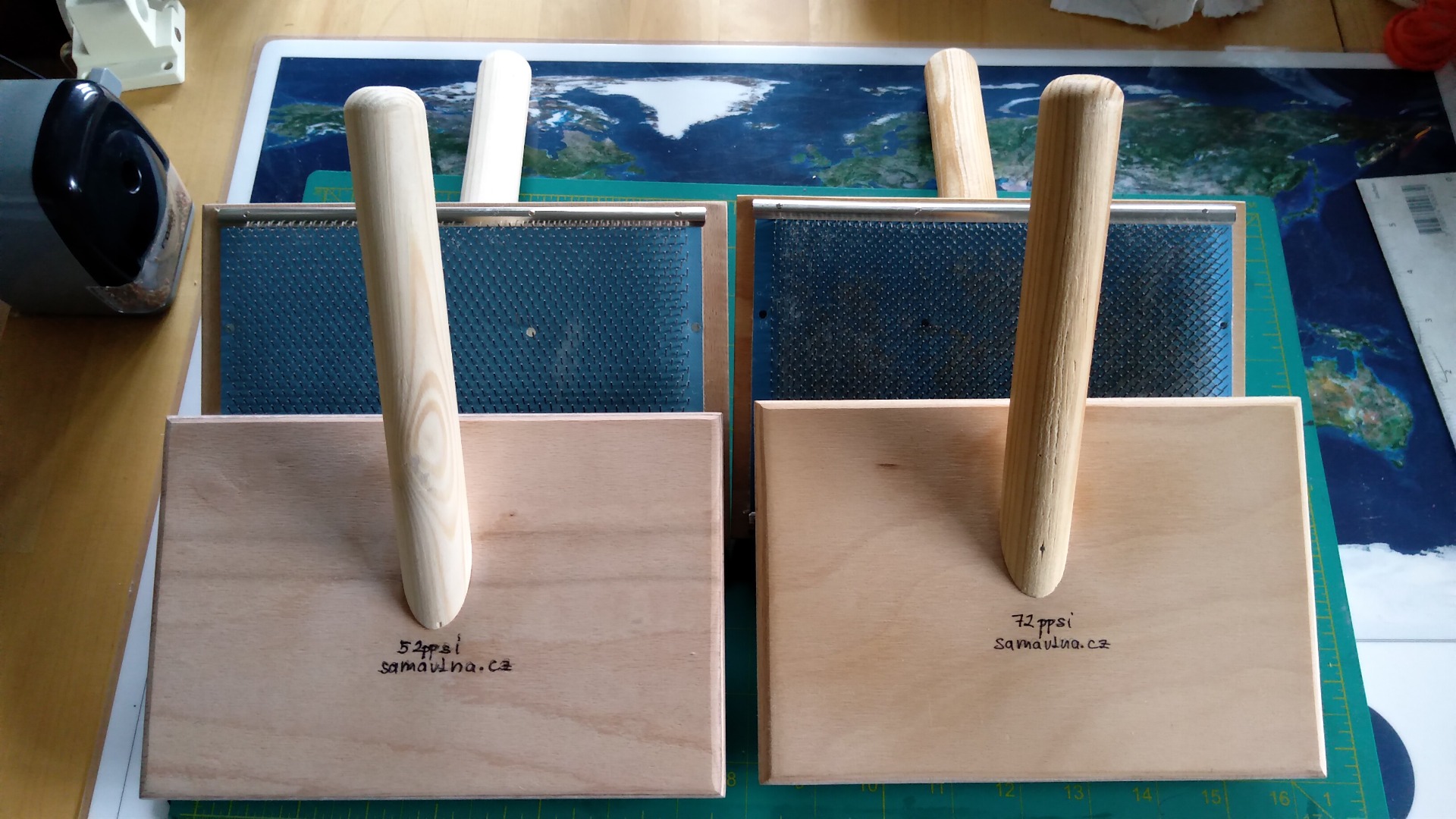 Zde moje dva páry kartáčů z e-shopu samavlna.cz. Vlevo jsou s hustotou 52 ppsi, vpravo s hustotou 72 ppsi. Vidíte je jak ze svrchní strany, tak i právě hustotu potahu a jeho uchycení.