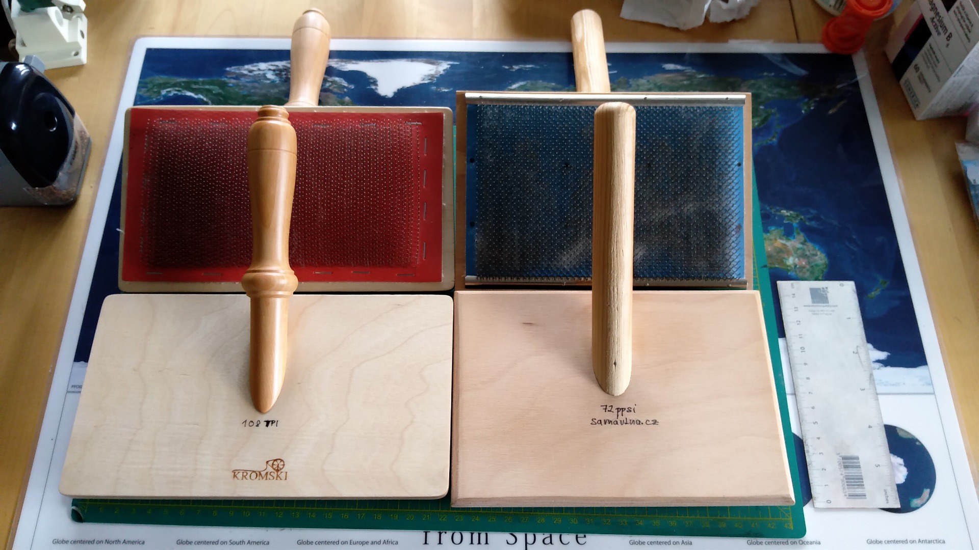 A na této fotce vidíte vlevo moje nejjemnější - Kromski 108 tpi, a to v porovnáním se zlatým středem - 72 ppsi. Všimněte si i porovnání rozměru desky a také rozměru oblasti ze zuby.