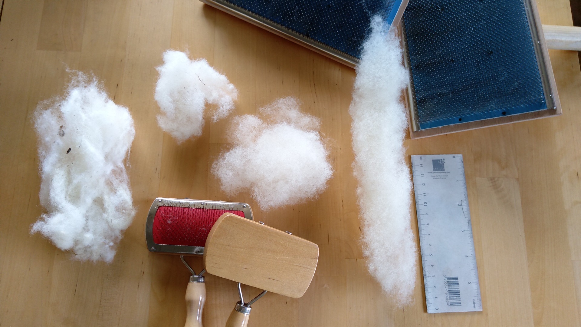 - mykání - eng. woolen preparation - kdy se vlákna sice uspořádávají jedním směrem, ale zároveň jsou síťově propojená. Ručně se toto provádí na kartáčích na vlnu (eng. hand carders). Vzniká tak něco, co já si pro sebe nazývám "housenky", anglicky jsem slyšela výraz "rolag". Případně v menším množství je možné využít tzv. bubnové česačky/mykačky (eng. drum carder), které jsou poháněné buď otáčením klikou a převody, případně elektromotorem. Vzniká cosi, co v angličtině je tuším označováno jako "batt". Tato příprava na ruční předení vnáší mezi vlákna vlny více vzduchu a vznikající příze je nadýchanější, ideální pro svetry, šály, čepice apod. Pochopitelně záleží i na způsobu spředení.
